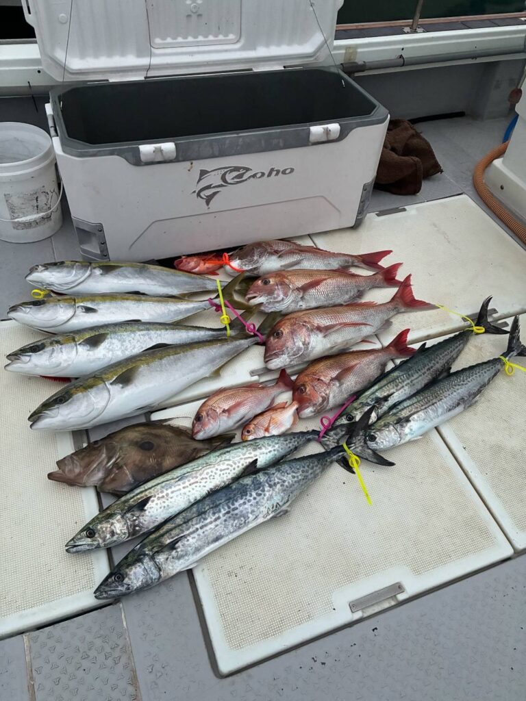 僚船から鰤ヒットのお知らせもらい向かうと反応は、有るがなかなか釣れずしかしみなさん頑張って頂き、ブリにメジロ サワラやタイといろいろ釣って頂けました。